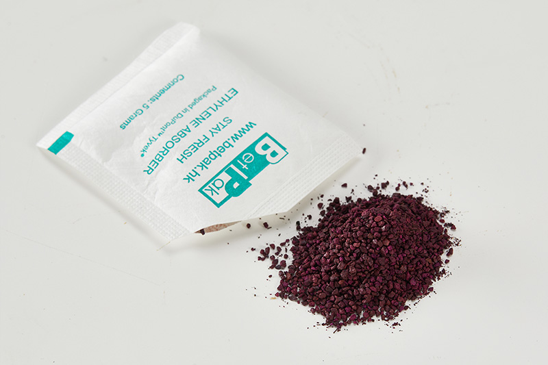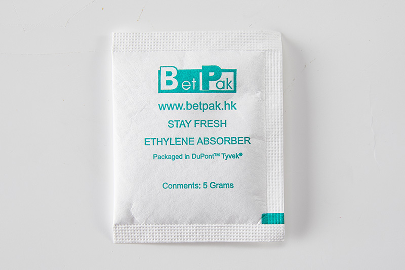 Betpak水果保鮮劑/乙烯吸收劑可使水果、蔬菜和花卉在12~16℃條件下存放60天。它的原理是在儲(chǔ)存、冷藏和運(yùn)輸過(guò)程中通過(guò)物理吸收并分解乙烯氣體。其包裝采用食品級(jí)、無(wú)毒、環(huán)保材料。